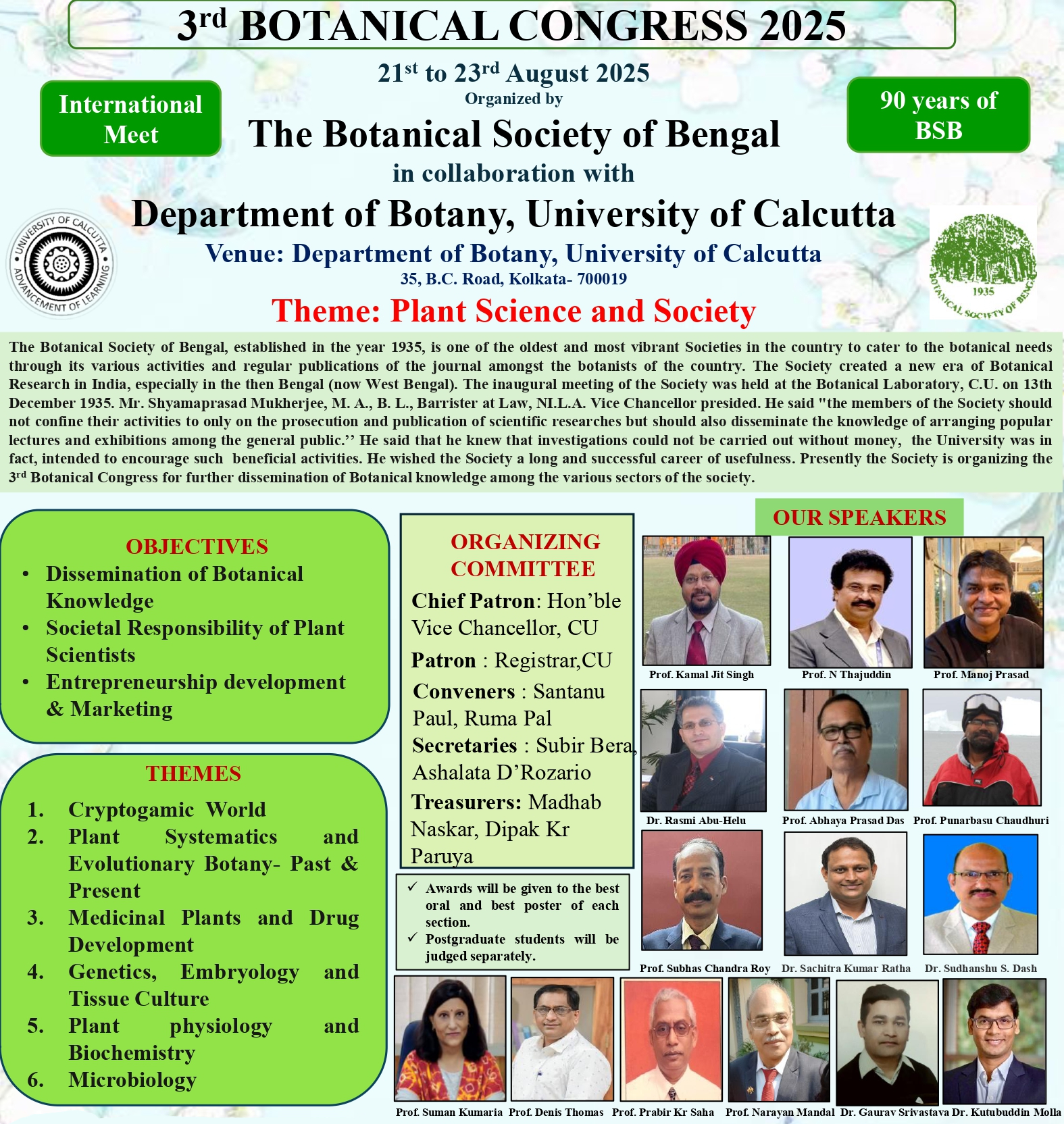 The Botanical Society of Bengal, established in the year 1935, is one of the oldest and most vibrant Botanical Societies in the country to cater to the botanical needs through its various activities and regular publications of its journals amongst the botanists of the country, particularly in Eastern India. Since inception, the Botanical Society of Bengal has been continuously striving to serve the cause of botany and is forging ahead following its charter of objectives. At present, the Society has about 396 life members.